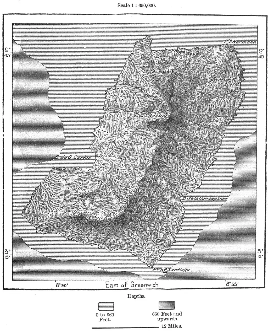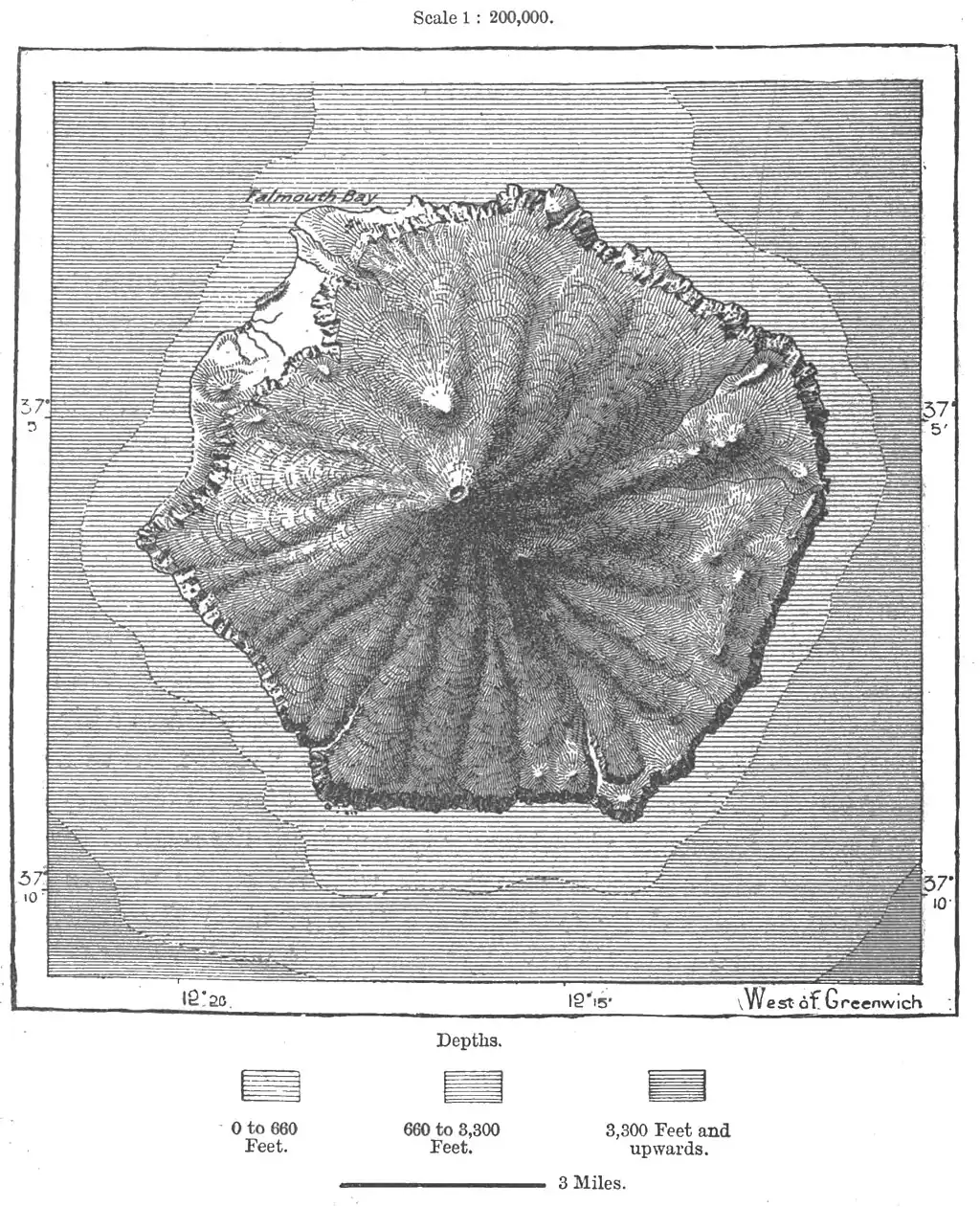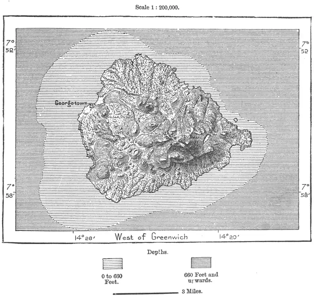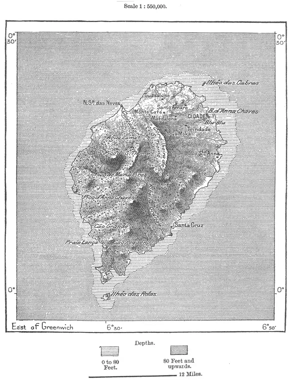 With the "Land of Life" have also disappeared several islands, the existence of which seemed firmly established by the circumstantial statements of navigators. Thus modern explorers have vainly sought for the island of Saint Matthew, which long figured on the old maps about the latitude of 2° 30' south of the equator. Yet the commander of a squadron of seven vessels had landed and remained fourteen days on this island in 1525. The description which he gives of it corresponds exactly with that of Annobon, which was probably the land visited by him, although he was out of his reckoning by some 600 miles, no unusual error in the history of navigation at that time. Another island, Santa-Croce, or Santa-Cruz, TBISTAM DA CUNHA. 97 also figured on the charts about ten degrees to the west of Saint Matthew, although no record existed of its discovery. This name may have possibly gone adrift on the high seas through confusion with the land of Santa-Cruz, the first Portuguese appellation of the Brazilian coast. G0N9AL0 Alvarez, or Gough. In the Austral Atlantic, the remotest island that may still be regarded as belonging to the African waters, is Goncalo Alvarez, so named from the pilot who discovered it early in the sixteenth century. This name, in its contracted form written / de g° Alvarez, became transformed to Diego Alvarez ; and when Gough rediscovered it in 1713, it became also known by his name. It is a craggy mass 4,350 feet high, and about 18 miles round, on the north and east fringed by three rocky islets, one of which takes the name of Church Rock, from its resemblance to a lofty nave flanked by its tower. A few sheltered creeks afford a landing on the large island, where settlers might be attracted by some fertile valleys, slopes densely clothed with brushwood, and waters well stocked with fish. But the island has only temporarily been visited by some American seal-fishers, who have reclaimed no land, living during their sojourn on fish and on birds which they attracted at night by large fires kindled on the headlands, Tristam da Cunha. About 240 miles to the north-west of Gough lies another rocky group on the highway between the Cape and the La Plata estuary, about 1,800 miles from the former and 2,400 from the latter. This is the Tristam da Cunha archipelago, so named from a navigator, " whose name," sings Camoens, " shall never extinguished be in the Austral isles washed by the Austral sea." Since its discovery in 1506 the group has been frequently visited by navigators, for it lies south of the zone of regular south-east winds, where vessels fall in with the strong western breezes, which enable them more easily to double the Cape of Good Hope. The large island is dominated by a regular snow-clad cone, rising to a height of from 8,000 to 8,500 feet, and visible at a distance of over 90 miles. Inaccessible, lying about 20 miles to the south-west of Tristam, takes its name from the steep cliffs, which can be approached only through some narrow ravines, and which form the pedestal of a rugged plateau often veiled by the clouds. Nightingale, 12 miles south-east of Inaccessible, is little more than a twin-peaked rock encircled by islets and reefs. These volcanic islands have altogether an area of over 20,000 acres, the principal island comprising over three-quarters of the whole extent. They are composed entirely of lavas, either compact or broken into innumerable frag- ments, or else reduced to a rich blackish mould. The highest peak in Tristam, which has been several times ascended, terminates, like the volcanic cones in the other islands, in a crater now flooded by a blue lake. Towards the north-west the lava-streams have acquired the appearance of a vast moraine descending down to the sea, and fringed by a sort of natural wall of blocks for a distance of some miles. These may possibly be traces of an old glacial epoch.