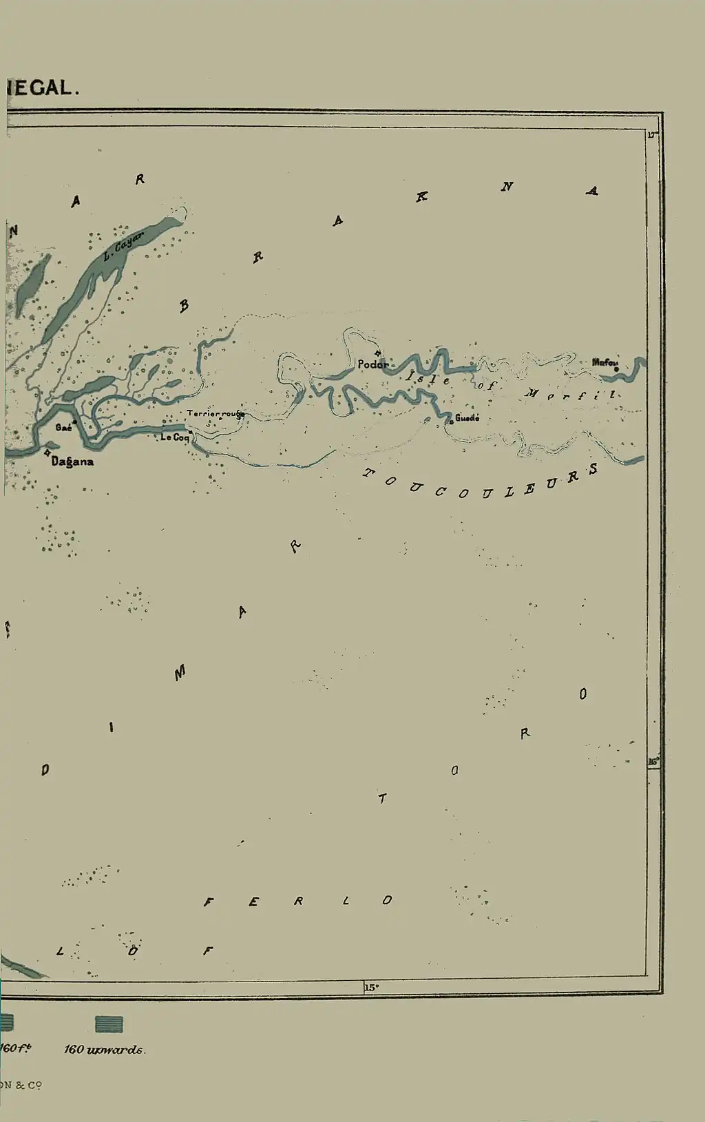 Towards its mouth the Senegal ramifies to the right and left into numerous channels or tortuous lagoons, here called "marigots," a term also wrongly applied to the permanent tributaries and to the brackish lacustrine basins on the coasts. During the floods these lagoons serve to relieve the overflow, which in the dry season is here husbanded as if in artificial reservoirs. The two largest of these side