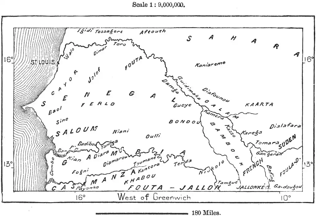 But towards the east and south Senegambia has no precise limits; in these directions the transitions take place imperceptibly, while the geographical features are marked by no striking contrasts. The water-parting between the affluents of the Senegal and Joliba is faint and uncertain, the traveller passing from one fluvial basin to the other without detecting any change in the aspect of the land. On the other hand, the ranges and groups of uplands in south Senegambia continue to develop towards the south-east as far as Liberia and the Ivory Coast, parallel with the continental seaboard. Nevertheless a certain geographical unity is presented by the oval space comprised between the Atlantic, the Senegal, the Upper Joliba, the Rokelle, and the plateau separating the sources of the two last-mentioned streams. The whole land may here be said to be grouped round the central mass of the Futa-Jallon highlands, whence the running waters flow in divergent beds towards the encircling main streams. The whole region, to which in its widest sense may be given the name of Senegambia, including the Saharian slope of the Senegal, and even some dried-up basins sloping southward, has a total area approximately estimated at 280,000 square miles. Sufficient data are still lacking to give any trustworthy estimate of the population, so that the current calculations naturally present the greatest discrepancies. If any dependence could be placed on the missionary De Barros' computation of fourteen millions, we should have a proportion of fifty to the square mile, a minimum ratio for a fertile and well-watered land, where the birth-rate is high and where the population rapidly increases in times of peace. Yet the data supplied by the European possessions, taken in connection with the reports of the most competent travellers, would seem to show that the actual population is far less than had been conjectured from the density of the villages in some of the coast districts, falling in fact to considerably under three millions.