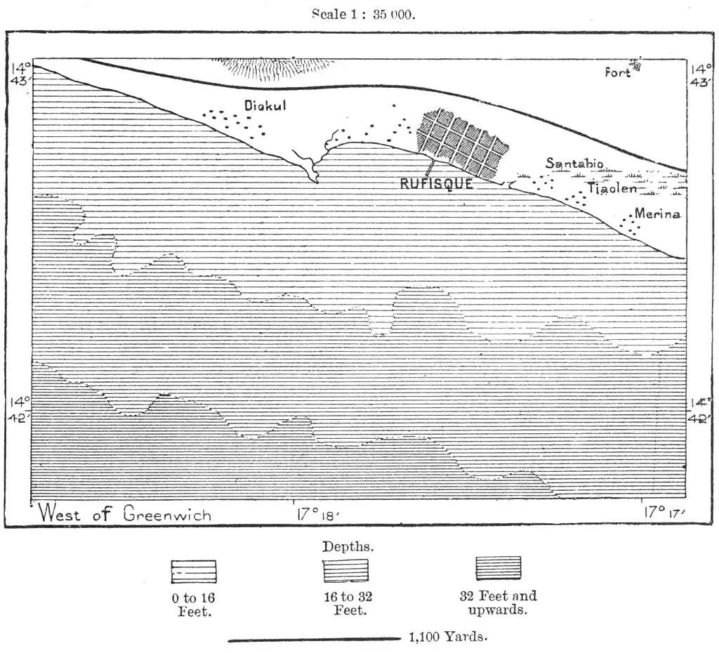 Being constantly exposed on one side to the fury of the surf, on the other to the pressure of the fluvial overflow, this sandy dyke yields now at one point now at another, again repairing the breach with the alluvial matter here arrested by the opposing fluvial and marine forces. The curve of the shore-line bears witness to the ceaseless encroachment on the sea which has been going on for ages. The sedimentary matter already deposited beyond the normal coastline, and rising above the surface, covers an area of at least 1,000 square miles, and the range of dunes which at one time developed a regular concave curve between Capes Mirik and Verd now bulges out some 12 miles seawards. Off the delta the waters are also much shallower than elsewhere along the coast, so that the 50-fathom line, running within 2 miles of Cape Verd, is deflected to 18 or 20 miles off the mouth of the Senegal.