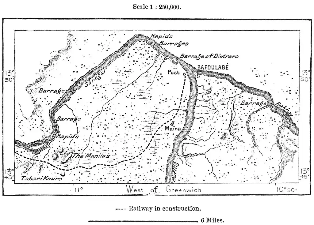 Bafulabé, last station on the Senegal proper, and first in French Sudan, stands at an altitude of 450 feet over against the Bafing-Bakhoy confluence, where it was founded in 1879 to support the military operations about to be undertaken in the direction of the Niger. It has already become a commercial centre, round which have sprung up seven flourishing villages, with gardens and banana plantations. In 1881 the station of Badumé was established on the Bakhoy, some 60 miles above Bafulabé, and the fortress of Kita was erected in the Fula-dugu country, midway between Bafulabé and the Niger. In 1883 the Niger itself was reached, and the erection begun of the fort of Bamaku, followed in 1884 and 1885 by two new fortified stations between Kita and Bamaku, Kundu on the northern and Niagassola