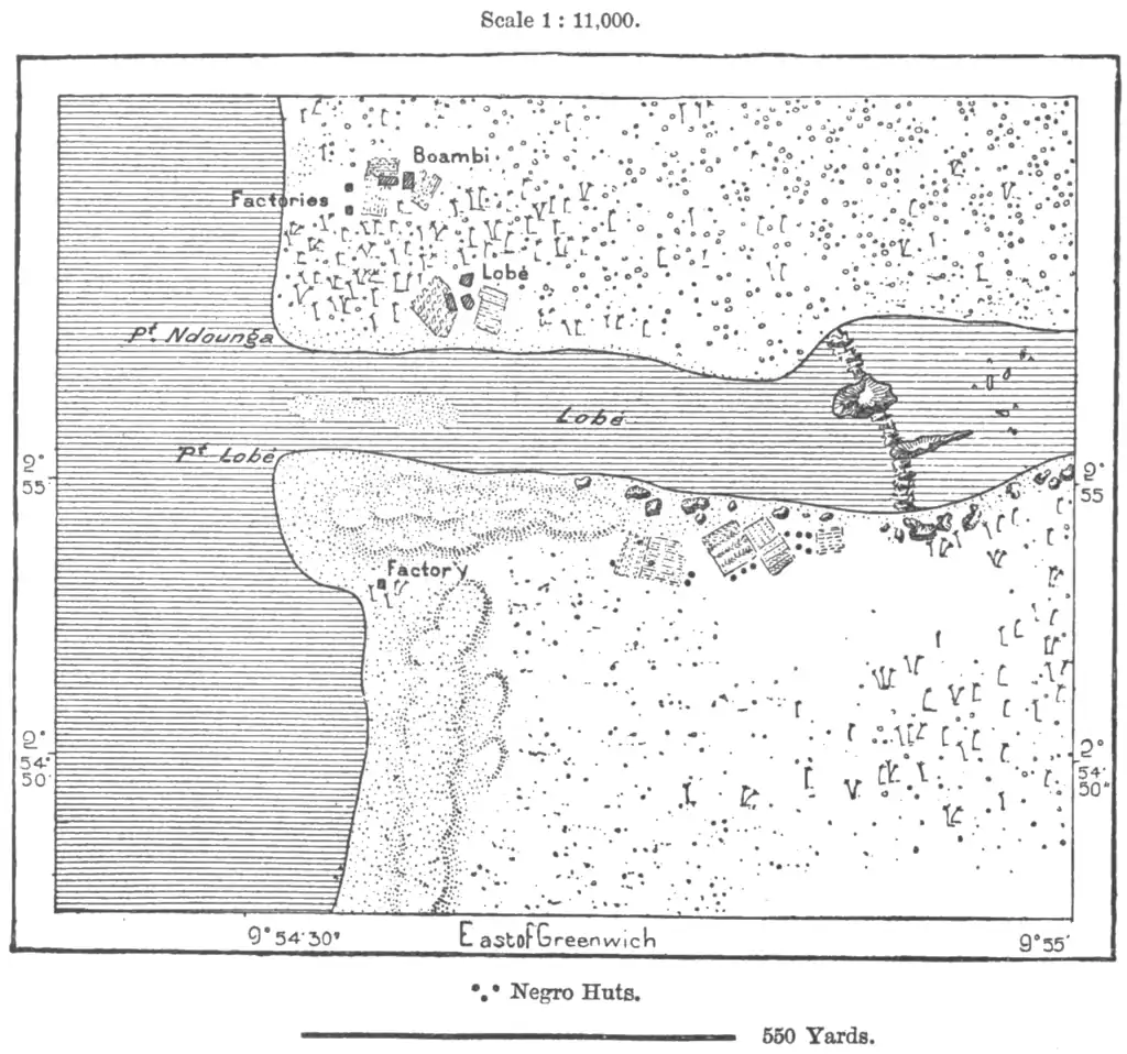 The Lobe, or "Great Ba-Tanga," a small stream chiefly fed by the surface waters from the Elephant Mountain during the rainy season, is famous for the beauty of its cascade, which is visible even from, the sea. At this distance it looks like a bright silver thread drawn across the current, but a nearer view reveals a broad sheet of water falling from a height of 50 feet over a rocky ledge above which rise two huge granite boulders, one crowned with a wide-branching tree and encircled by a green girdle of brushwood. Half a mile lower down the river enters the sea between two sandy banks strewn with granite rocks.