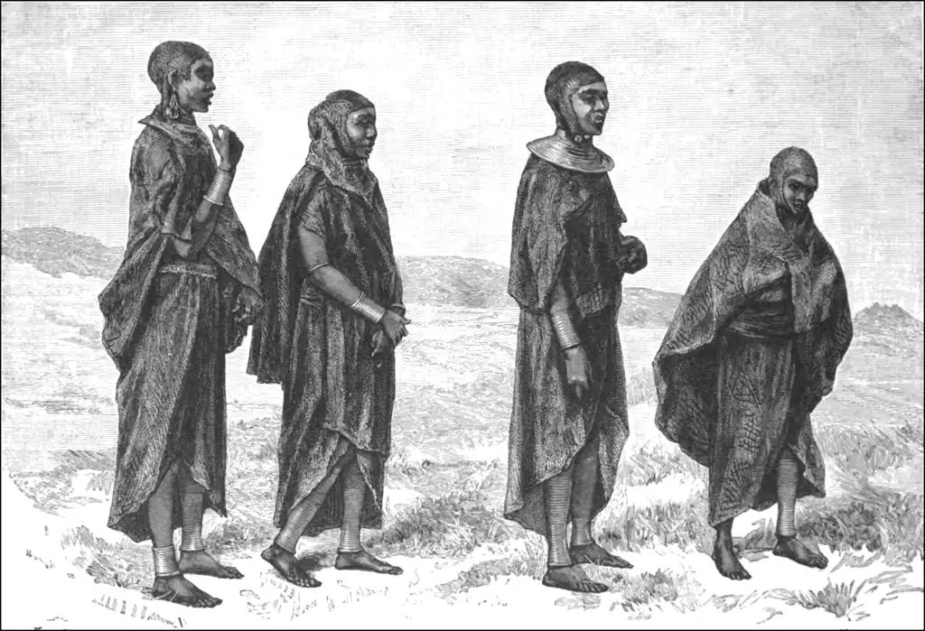 The Teïta Mountains, which are crossed by the route leading from Mombaz to Kilima-Njaro, are also occupied by tribes of Bantu stock, speaking a dialect closely related to Ki-Swaheli, and according to Rebmann collectively numbering about a hundred and fifty thousand souls. These Wateïtas (Wa-Teita) are constituted in republican communities, which sheltered behind their rocky fastnesses, have often repulsed the attacks of the savage Masai marauders. Amongst them the primitive custom of carrying off the bride by violence still survives in the form of a pretended abduction. The husband and his friends remove her by a show of force to his newly erected hut, where both are left shut up for three days without any food whatever. But the make believe capture is always preceded by a present of cattle to her parents, and the number of animals usually demanded on these occasions is so great, that rich persons alone are able to afford the luxury of a regular marriage. Owing to the general poverty, many less formal alliances are consequently contracted, often within close degrees of kinship. The Teïta women enjoy a large share of personal freedom. Whenever she feels herself in any way aggrieved, the wife may leave her husband without let or hindrance on his part. The Wateïtas bury their dead in the first instance, but after several months of interment the body is dug up and the head detached and placed apart in a sacred grove, where it is regularly consulted by the magicians. Although possessing numerous herds, the Wateïtas eat only such animals as die of the cattle-plague.