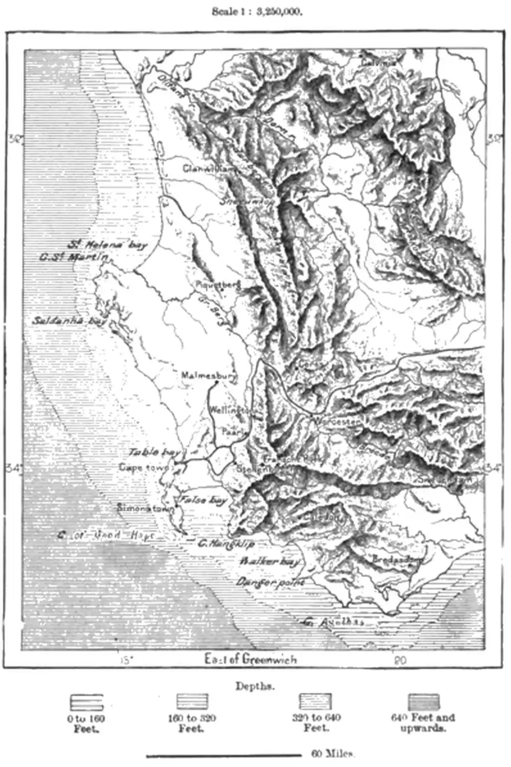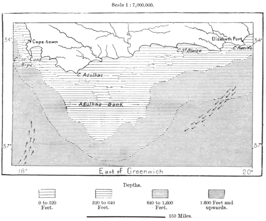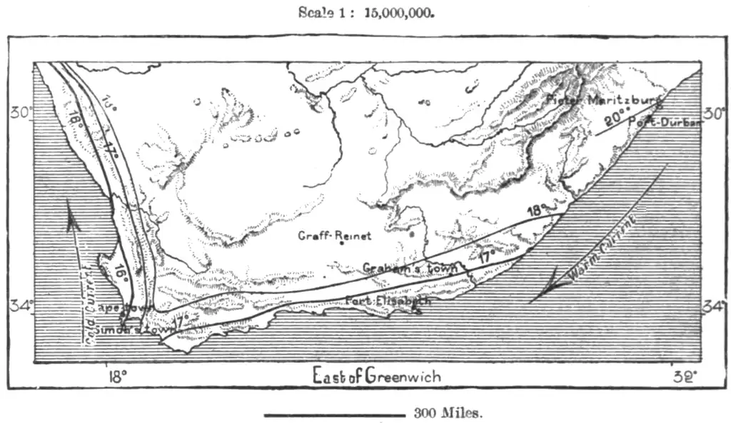 Another circumstance tends to cool the extremity of Austral Africa compared with the Mediterranean regions under corresponding latitudes. A large section of its seaboard is turned towards the cold Antarctic Ocean, from which numerous icebergs and much drift ice often float with the marine current in the direction of the Cape.[1]