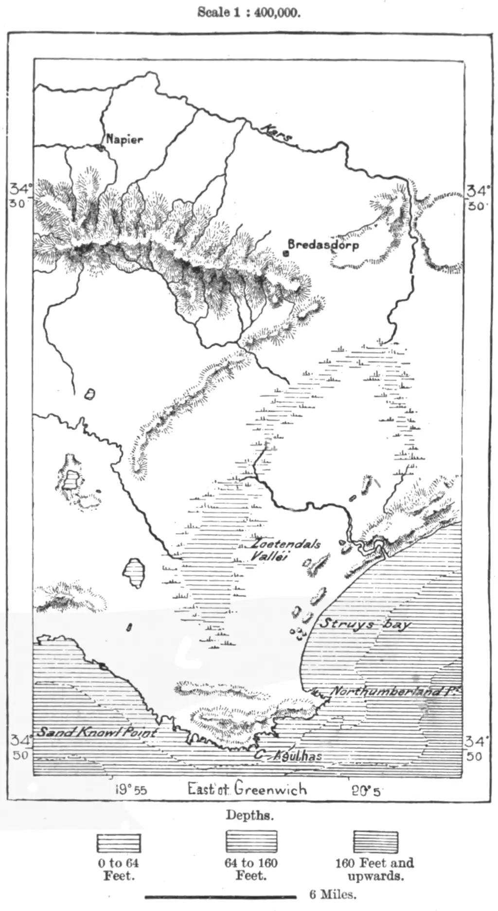 East of the parallel mountain ranges, which run north and south in the vicinity of the Atlantic seaboard, the folds and wrinkles of the land, resembling the gatherings round the hem of a garment, are disposed in the direction from west to east nearly parallel with the shores of the Southern Ocean. Nevertheless it is evident from the lie of the land that all these border ranges run somewhat obliquely to the coast, for they all terminate in the sharp promontories, which follow in succession to the east of Cape Agulhas, or the "Needles," terminal point of the African mainland. They formerly extended continuously from west to east, but are now broken into fragments of varying size by numerous torrents, which rising in the interior have forced their way seawards at the weaker points of the old formations.