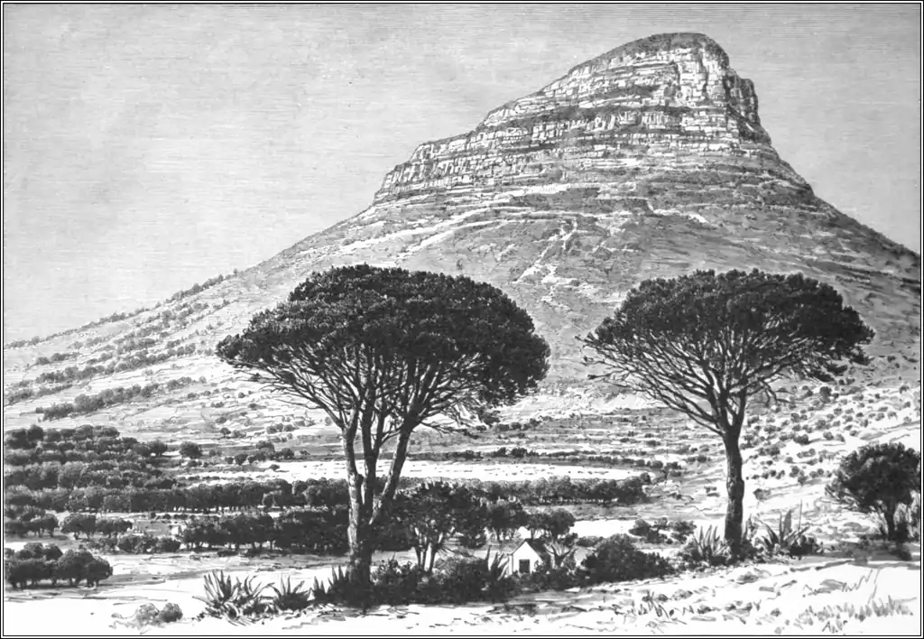 and his magnificent head facing seawards. Beyond Table Mountain the hills fall gradually southwards down to the famous headland of the Cape of Good Hope.