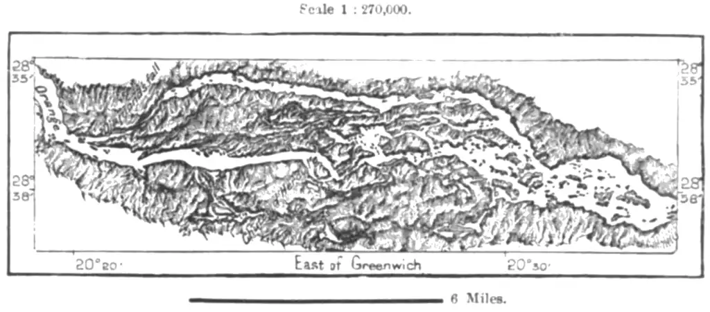 Farther north the slope of the plateau falls imperceptibly in the direction of 86 SOUTH AND EAST AFRICA. the Limpopo. In this northern section of the Border llunge the last crest which exceeds 7',000 feet is the Mauchberg (7,300), so named from the explorer who discovered the goldfields of this region. Nevertheless the Zoutpansbergen, or " Saline Mountains," at the northern extremity of the whole system, still present an imposing aspect, thanks to the precipitous slope of their escarpments down to the valley of the Limpopo. Towards the south-west some disconnected ranges of hills and scattered heights serve to break the monotony of the upland plains, which descend with a gentle incline towards the less elevated depression of the Kalahari Desert. But these eminences produce little effect, owing to the great relative altitude of the surrounding plateau. They culminate in the Magalies- bergen, near Pretoria, capital of the South- African Republic (Transvaal). Geological Formations. Throughout the whole of Austral Africa, comprising Cape Colony, Kafirland, Natal, the Basuto, Zulu, and Dutch territories, the general geological substratum is constituted by granitic rocks, which underlie all the other formations of this region. By their incessant erosive action the running waters have everywhere exposed the lower granitic foundation and the sedimentary strata deposited on the primitive crystalline rocks. As remarked by Livingstone, the granite back- bone is concealed, but it here and there breaks through the skin. The granite is itself traversed in all directions by veins of a very pure white quartz, which are almost everywhere associated with auriferous deposits. But except in some rare districts these deposits are not sufficiently abundant to render mining operations remunerative. Throughout the whole of the coastlands the underlying granite is covered by crystallised limestones, while in the interior the granite is overlain chiefly by carboniferous series and Devonian formations with their crown of sand- stone rocks. Some geologists point to heaps of displaced and striated boulders, as clear indications of a former glacial period on the eastern slopes of the Drakenberg. Most observers also accept the view that the seaboard is at present undergoing a process of slow upheaval. From the Cape of Good Hope all the way to the coast of Natal may be seen old tracings of raised beaches still covered with banks of marine shells, oysters, and polyps. Near the south frontier of Natal these elevated banks stand nearly fourteen feet above the present level of the highest spring tides.* Rivers— The Orange. The great watercourse of Austral Africa, and one of the most considerable in the whole Continent, if not for its volimie, at least for the length of its course and the extent of its basin, is the Gariep of the Hottentots, the Groote-rivier (" Great River ") of the Boers. In the year 1770 it received from Gordon, an officer in the Dutch service, the name of Orange, more in honour of the royal • Griesbach, Qtiarterly Journal of the Geological Society, May, 1871. house than from the colour of its waters. The Senku, or chief eastern headstream, is regarded as its true upper course, although exceeded in length by the Vaal. It has its source in an upland valley on the southern slope of the Cathkin, and flows at first in a south-westerly direction between the Maluti and Drakenberg highlands. In this part of its course it rolls down a dark stream, whence its local name of the "Black River." After its junction with the Senkunyané, or Little Senku, it is again swollen by the Malitsunyané, which descends from the western uplands, and which at one point plunges from a vertical height of 600 feet into a tremendous mountain gorge.