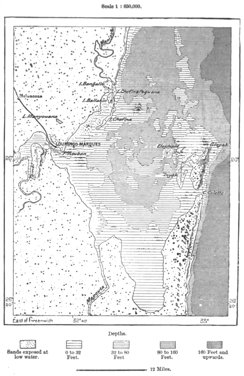 valuable acquisition for the Dutch republics, which have hitherto been cut off from all communication with the sea. Hence the eagerness is easily explained with which the Boers of the Transvaal have so far unsuccessfully endeavoured to secure against the opposition of England an outlet at this point of the seaboard. 94 SOUTU AND EAST AFfilCA. Delagoa Bay. Far more important in every respect is the northern inlet of Delagoa Bay, which, opening northwards, presents good anchorage in over 60 feet of water, easily accessible to the largest vessels through a well-sheltered passage running some distance iuland. Hence the British Government for some time disputed the possession of this valuable harbour of refuge with the Portuguese, who relied on their long-established claims to its exclusive ownership. England asserted her right especially to occupy the island of Inyak, which forms a northern extension of the peninsula of like name at the entrance of the bay. Nevertheless the President of the French Republic, to whom the question had been referred for arbitration in the year 1875, decided in favour of Portugal, assigning to her the free disposition of all the lands encircling the bay, which cannot fail to become the commercial outlet for the produce of all the inland states. Between the St. Lucia and Delagoa inlets, the form of the sandy coast as well as that of the lagoons disposed in the same direction, together with the course of all the rivers which here trend northwards, all seems to point at the action of a marine current steadily setting in the direction from south to north along this seaboard. Such a current would be opposed to that flowing south- wards from Mozambique, while its action on the sandy coast would be mucli promoted by the heavy seas rolling in from the Indian Ocean under the influeucj of the south-east trade-winds. In this way may have been formed the outer coast-line formed by a long succession of sandy tongues, all skirting the east side of the shallow coast lagoons and running parallel with the true continental shore- line. North of Delagoa Bay the altered conditions must give rise to the opposite phenomenon. Here the marine current sets southwards, while the Manissa River, instead of flowing in a straight line seawards, is deflected along its lower course in a line parallel with the coast itself. It thus flows for a considerable distance towards the south before mingling its waters with those of the bay. Several other rivers converge towards the same basin. From the south comes the Maputa, which is formed by numerous watercourses which have their rise in the interior of the Zulu and Swazi territoiies. From the west descend the Tembi and Um-Bolozi, reaching the estuary in a united stream at the point where is situated the town of Louren90 Marques. Lastly frcm the north ccmes the copious current of the already mentioned Manissa. Thanks to the high tides and ' the natural depth of their channels, all these affluents of the baj' are accessible to shipping for some distance inland. The Manissa, that is, the King George River of the English settlers, was ascended for 130 miles from its mouth by Hilliard, who nowhere found it less than 3J feet deep. Hence this watercourse would afford easy access to the auriferous regions of the inteiior, but for the marshy tracts, which occur at many points along its course, and which render the climate extremely malarious. The Manissa was long supposed to be the lower course of
