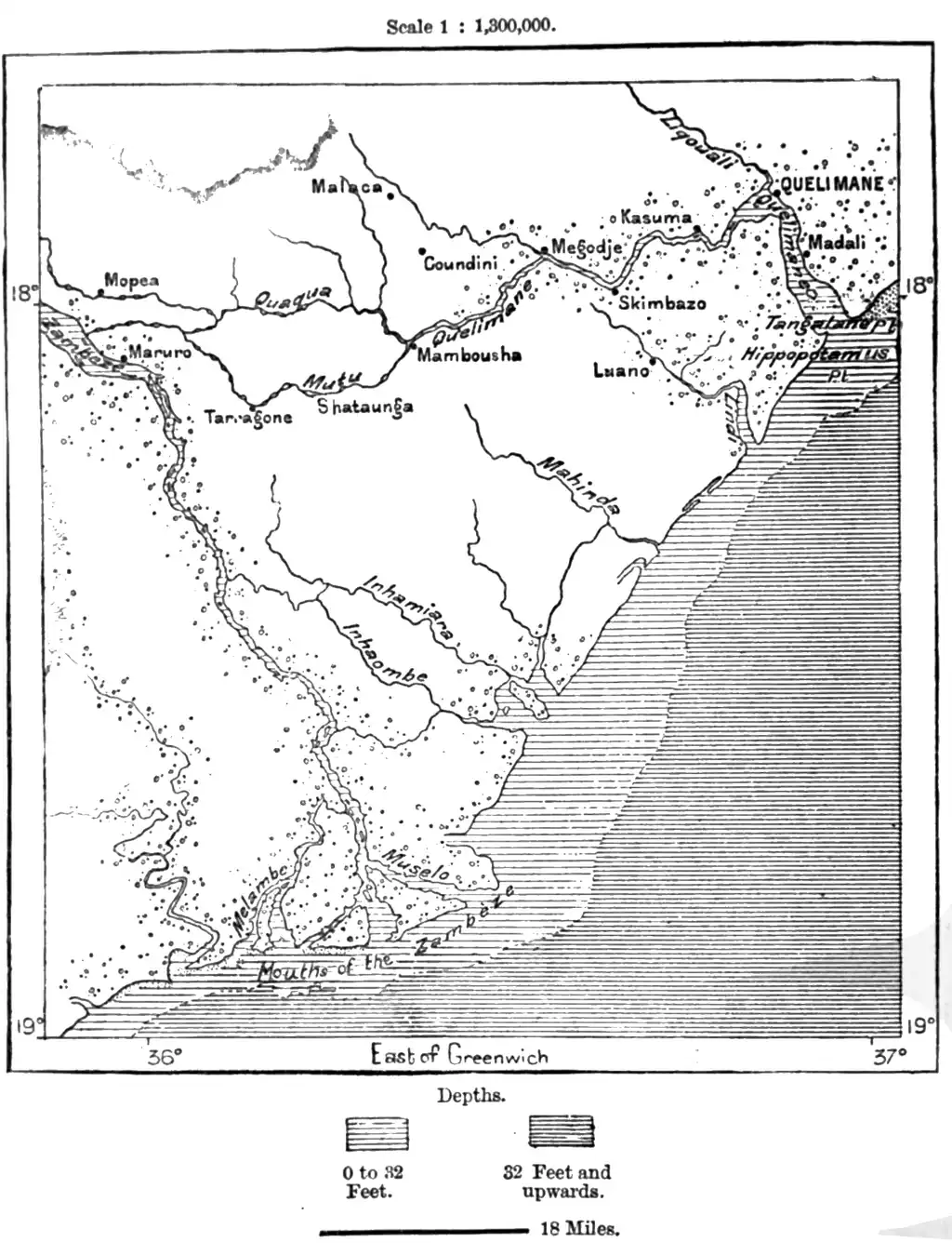 Below Shupanga, but on the opposite bank, stand the stations of Mopea and Masaro, half embowered in the dense foliage of overhanging mango-trees. These villages enjoy some importance as landing-places for the riverain traffic, and as guardians of the portage between the Zambese and the Kwa-Kwa, or river of Quelimane. Recently, a domain of 125,000 acres, stretching along the left bank of the Lower Zambese as far as the neighbourhood of the Shire, was granted by the Portuguese Government to an "Opium Company," in the hope that it might compete successfully with the British growers of the baneful drug in India. The company also enjoyed several other privileges, besides the right of levying the mussoro tax on the natives. Nevertheless it proved a failure, having been purtly ruined by a revolt of the black populations in the