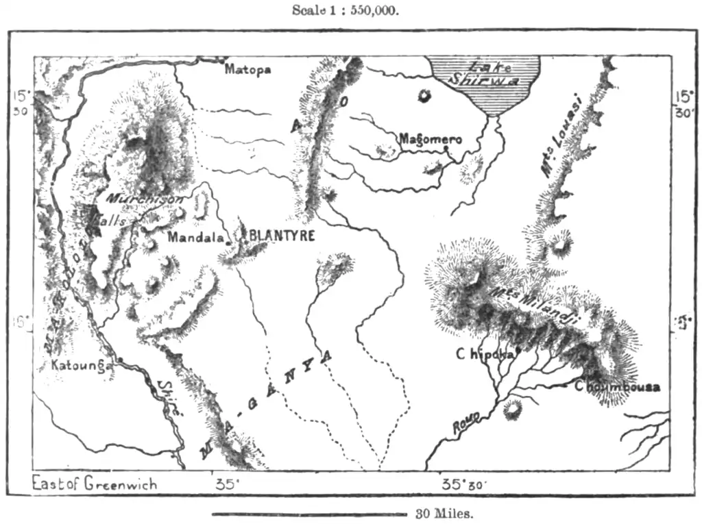 South of the confluence of the Ruo or Luo, which flows from the Blantyre uplands, and which is navigable by boats for 50 miles, a huge nearly isolated and