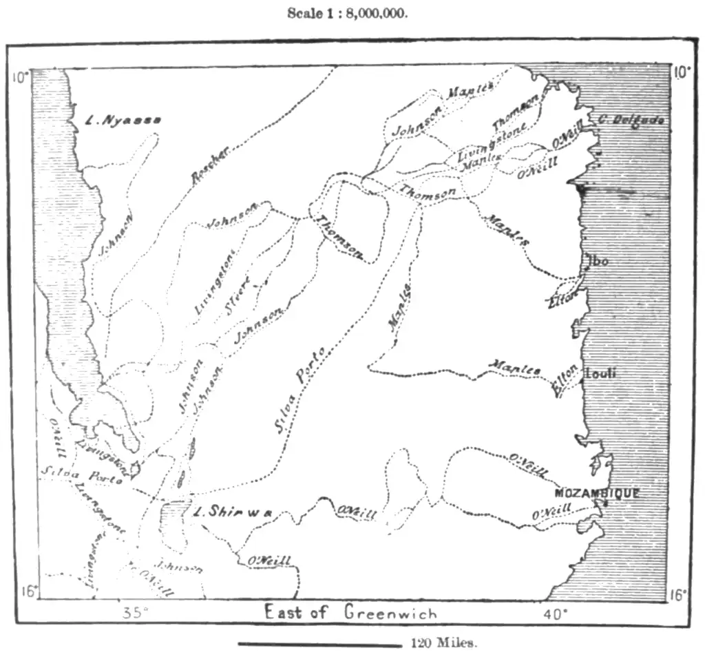 The journeys of Lacerda and his successor Gamitto were the first serious geographical expeditions, and even these were directed towards the regions beyond Nyassa. Then came Roscher, Johnson, Last, Cardozo, and especially O'Neill, by whom the Mozambique lands have been traversed in every direction during the latter half of the present century. Strictly speaking, this territory has become a part of the known world mainly through the labours of O'Neill, by whom the banks of the Shire and of Lake Nyassa have been connected with the maritime ports by carefully surveyed routes comprising a total length of about 4,000 miles, It would scarcely be unfair, says an English writer, to give to this region the name of O'Neill's Land, in honour of the explorer who first laid down on our maps the true features of its mountains, lacustrine basins, and running waters. The territory thus newly acquired by science comprised a superficial area of about 140,000 square miles, with a population approximately estimated at a million souls.
