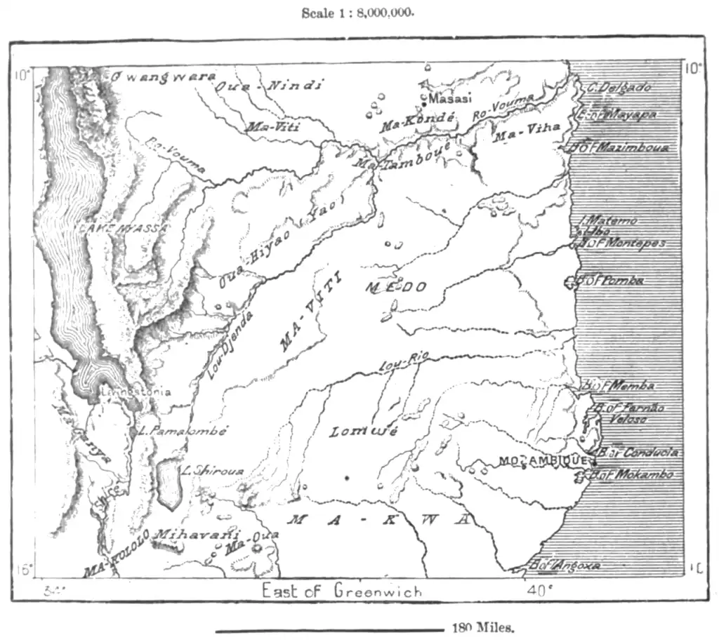 The section of the seaboard, extending for a distance of about 300 miles nearly in a line with the meridian, from Mokambo Bay to the Rovuma estuary, presents