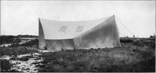 Field tent for aeroplane: back view. Supported by two poles only;