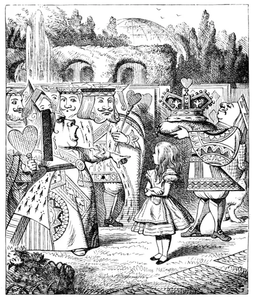 First came ten soldiers carrying clubs; these were all shaped like the three gardeners, oblong and flat, with their hands and feet at the corners: next the ten courtiers; these were ornamented all over with diamonds, and walked two and two, as the soldiers did. After these came the royal children; there were ten of them, and the little dears came jumping merrily along hand in hand, in couples: they were all ornamented with hearts. Next came the guests, mostly Kings and Queens, and among them Alice recognised the White Rabbit: it was talking in a hurried nervous manner, smiling at everything that was said, and went by without noticing her. Then followed the Knave of Hearts, carrying the King's crown on a crimson velvet cushion; and, last of all this grand procession, came THE KING AND QUEEN OF HEARTS.