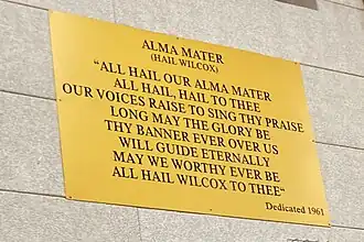 "All hail our alma materAll hail, hail to theeOur voices raise to sing thy praiseLong may thy glory beThy banner ever over usWill guide eternallyMay we worthy ever beAll hail Wilcox to thee"