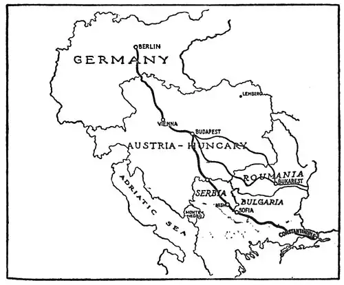 I wish to direct particular attention to this railroad, for it was, after all, the main strategic prize for which Germany was contending. After leaving Sofia it crosses northeastern Serbia, the most important stations being at Nish and Belgrade. From the latter point it crosses the River Save and later the River Danube, and thence pursues its course to Budapest and Vienna and thence to Berlin. Practically all the military operations that took place in the Balkans in 1915-16 had for their ultimate object the possession of this road. Once holding this line Turkey and Germany would no longer be separated; economically and militarily they would become a unit. The Dardanelles, as I have described, was the link that connected Russia with her allies; with this passage closed Russia's collapse rapidly followed. The valleys of the Morava and the Maritza, in which this railroad is laid, constituted for