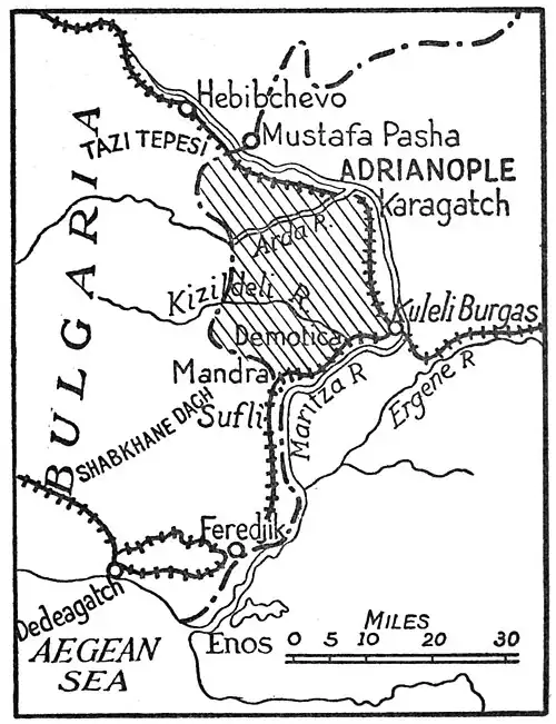 Germany, said Weitz, had won over Bulgaria by doing something which the Entente had not been able and willing to do. It had secured her the possession at once of a piece of coveted territory. Serbia had refused to give Bulgaria immediate possession of Macedonia; Turkey, on the other hand, had now surrendered a piece of the Ottoman Empire. The amount of land in question, it is true, was apparently insignificant, yet it had great strategic advantages and represented a genuine sacrifice by Turkey. The Maritza River, a few miles north of Enos, bends to the east, to the north, and then to the west again, creating a block of territory, with an area of nearly 1,000 square miles, including the important cities of Demotica, Kara Agatch, and half of Adrianople. What makes this land particularly important is that it contains about fifty miles of the railroad which runs from Dedeagatch to Sofia. All this railroad, that is, except