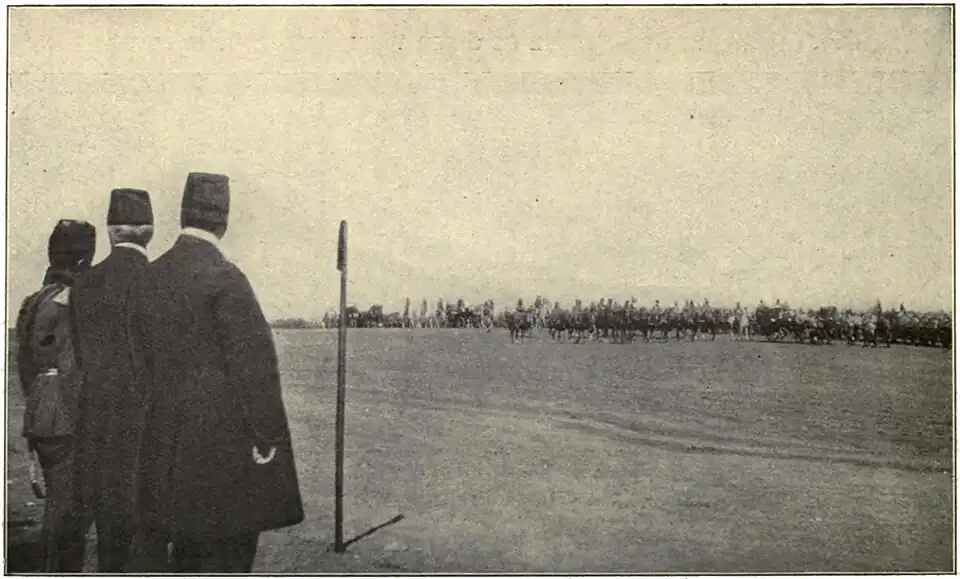 Observing the transfromation worked in the Turkish army by its German drill-masters. Talaat is the huge, broad-shouldered man at the right; Enver is the smaller figure to the left