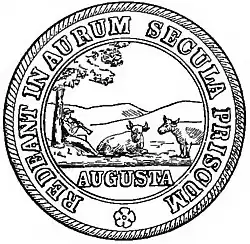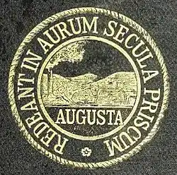 The motto maybe translated thus: "Let the ages return to the first golden period." The allusion is, of course, to the fabulous "Golden Age" of primal simplicity and enjoyment; and the Roman poets held out the hope that this happy state of things would one day return.