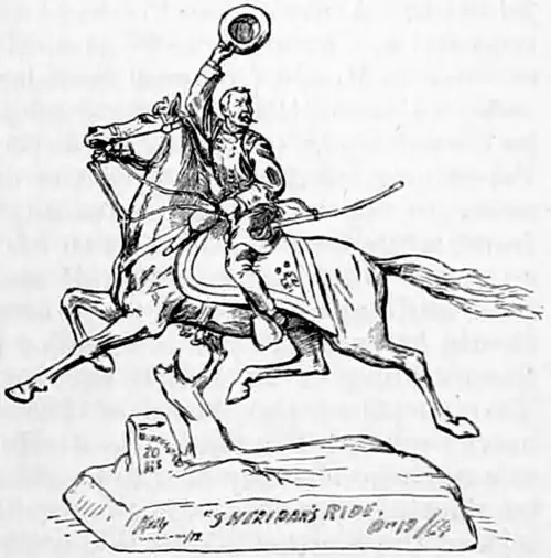The vigor, judgment, and dash of Sheridan had now marked him in the eyes of Grant as fit for a far more important station. Early in August, 1864, he was placed in command of the Army of the Shenandoah, formed in part from the army of Hunter, who retired from the command, and from that time till the end of the war Sheridan seems never to have encountered a military problem too difficult for his solution. His new army consisted at first of the 6th corps, two divisions of the 8th, and two cavalry divisions, commanded by Gens. Torbert and Wilson, which he took with him from the Army of the Potomac. Four days later, 7 Aug., the scope of his command was constituted the Middle Military Division. He had an arduous and difficult task before him to clear the enemy out of the valley of Virginia, break up his magazines, and relieve Washington from chronic terror. Sheridan grasped the situation at once. He posted his forces in front of Berryville, while the enemy under Early occupied the west bank of Opequan creek and covered Winchester. In his division, besides the 6th corps under Wright and the 8th under Crook, Sheridan had received the addition of the 19th, commanded by Emory. Torbert was placed in command of all the cavalry. Having great confidence in Sheridan, Grant yet acted with a proper caution before giving him the final order to advance. He went from City Point to Harper's Ferry to meet Sheridan, and told him he must not move till Lee had withdrawn a portion of the Confederate force in the valley. As soon as that was done he gave Sheridan the laconic direction, “Go in.” He says in his report: “He was off promptly on time, and I may add that I have never since deemed it necessary to visit Gen. Sheridan before giving him orders.” On the morning of 19 Sept., Sheridan attacked Early at the crossing of the Opequan, fought him all day, drove him through Winchester, and sent him “whirling up the valley,” having captured 5,000 prisoners and five guns. The enemy did not stop to reorganize until he had reached Fisher's hill, thirty miles south of Winchester. Here Sheridan again came up and dislodged him, driving him through Harrisonburg and Staunton, and in scattered portions through the passes of the Blue Ridge. For these successes he was made a brigadier-general in the regular army on 10 Sept. Returning leisurely to Strasburg, he posted his army for a brief repose behind Cedar creek, while Torbert was despatched on a raid to Staunton, with orders to devastate the country, so that, should the enemy return, he could find no subsistence, and this was effectually done. To clear the way for an advance, the enemy now sent “a new cavalry general,” Thomas L. Rosser, down the valley; but he was soon driven back in confusion. Early's army, being re-enforced by a part of Longstreet's command, again moved forward with celerity and secrecy, and, fording the north fork of the Shenandoah, on 18 Oct. approached rapidly and unobserved, under favor of fog and darkness, to within 600 yards of Sheridan's left flank, which was formed by Crook's corps. When, on the early morning of the 19th, they leaped upon the surprised National force, there was an immediate retreat and the appearance of an appalling disaster. The 8th corps was rolled up, the exposed centre in turn gave way. and soon the whole army was in retreat. Sheridan had been absent in Washington, and at this juncture had just returned to Winchester, twenty miles from the field. Hearing the sound of the battle, he rode rapidly, and arrived on the field at ten o'clock. As he rode up he shouted to the retreating troops: “Face the other way, boys; we are going back!” Many of the Confederates had left their ranks for plunder, and the attack was made upon their disorganized battalions, and was successful. A portion of their army, ignorant of the swiftly coming danger, was intact, and had determined to give a finishing-blow to the disorganized National force. This was caught and hurled back by an attack in two columns with cavalry supports. The enemy's left was soon routed; the rest followed, never to return, and the valley was thus finally rendered impossible of occupancy by Confederate troops. They did not stop till they had reached Staunton, and pursuit was made as far as Mount Jackson. They had lost in the campaign 16,952 killed or wounded and 13,000 prisoners. Under orders from Grant, Sheridan devastated the valley. He has been censured for this, as if it were wanton destruction and cruelty. He destroyed the barns and the crops, mills, factories, farming-utensils, etc., and drove off all the cattle, sheep, and horses. But, as in similar cases in European history, although there must have been much suffering and some uncalled-for rigor, this was necessary to destroy the resources of the enemy in the valley, by means of which they could continually menace Washington and Pennsylvania. The illustration is a representation of “Sheridan's Ride,” a statuette, by James E. Kelly. The steel portrait is taken from a photograph made in 1884. The terms of the president's order making Sheridan a major-general in the army were: “For personal gallantry, military skill, and just confidence in the courage and patriotism of his troops, displayed by Philip H. Sheridan on the 19th of October at Cedar Run, where, under the blessing of Providence, his routed army was reorganized, a great national disaster averted, and a brilliant victory achieved over the rebels for the third time in pitched battle within thirty days, Philip H. Sheridan is appointed major-general in the United States array, to rank as such from the 8th day of November, 1864.” The immediate tribute of Grant was also very strong. In an order that each of the armies under his command should fire a salute of one hundred guns in honor of these victories, he says of the last battle that “it stamps Sheridan, what I have always thought him, one of the ablest of generals.” On 9 Feb., 1865, Sherid
