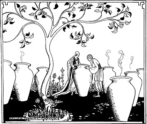 Though naturally much surprised at finding a man in the jar instead of the oil she wanted, she immediately felt the importance of keeping silence, feeling sure that Ali Baba, his family, and herself were in great danger. Collecting herself, without showing the least emotion, she answered, “Not yet, but presently.” She went quietly in this manner to all the jars, giving the same answer, till she came to the jar of oil.