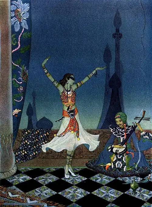 As soon as Abdalla saw that Ali Baba and Cogia Houssain had done talking, he began to play on the tabor, and to sing an air, to which Morgiana, who was an excellent performer, danced in such a manner as would have created admiration in any company.