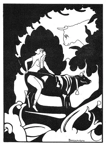 One day in wood-crowned Ida's shady vale, a white bull went wandering by. The pride of all the herd was he. Between his horns was just a single spot of black; save for that mark, his body was as white as milk; and all the heifers of Gnossus and of Cydonia sighed for the joy of his caress. Pasiphaë conceived a passion for him and viewed with jealous eye the loveliest among the heifers. There's no gainsaying it, Crete with her hundred cities, Crete, liar though she be, cannot deny it. ’Tis said that Pasiphaë, with hands unused to undertake such toil, tore from the trees their tenderest shoots, culled from the meadows bunches of sweet grass and hastened to offer them to her beloved bull. Whithersoever he went, she followed him;