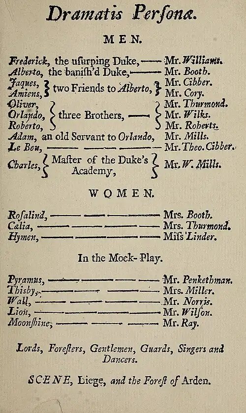 The facsimile opposite shows the cast which performed Johnson's adaptation of 'As You Like It' in 1723, and suggests the nature of the alterations made by Johnson. (See Appendix B for further details.) The title-page mentions neither Shakespeare's name nor that which he gave the comedy. It runs as follows: 'Love in a Forest. A Comedy. As it is Acted at the Theatre Royal in Drury-Lane, By His Majesty's Servants . . . By Mr. Johnson . . . 1723.'