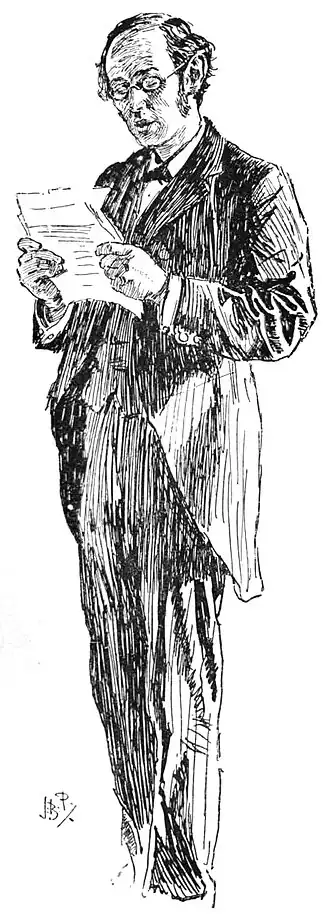 "Had such shocking sentiments been aired by some of the other lady orators in this room, I must facetiously have recalled them to a certain fabular fox which criticised the unattainable grapes as too immature to merit mastication; but the particular speaker cannot justly be said to be on all fours with such an animal. Understand, please, I am no prejudiced, narrow-minded chap. I would freely and generously permit plainfaced, antiquated, unmarriageable madams and misses to undertake the manufacture of their own careers ad nauseam; but when I behold a maiden of such excessive pulchritude(Second intervention by Hon'ble Chairwoman desiring me to abstain from personal references.) I assure the Hon'ble Miss Chairwoman that I was not alluding to herself, but since she has spoken in my wheel with such severity, I will conclude with my peroration on the subject for debate, namely, the theatrical dramas of Hon'ble Ibsen. When, Madams and Misses, I make the odious comparison of these works, with which I am completely unacquainted, to the productions of Poet Shakspeare, where I may boast the familiarity that is a breeder of contempt, I find that, in Hamlet's own words, it is the 'Criterion of a Satire,' and I shall assert the unalterable a priori of my belief that the melodious Swan of Stony Stratford, whether judged by his longitude, his versical blankness, or the profoundity of his attainments in Chronology, Theology, Phrenology, Palmistry, Metallurgy, Zoography, Nosology, Chiropody, or the Musical Glasses, has outnumbered every subsequent contemporary and succumbed them all!"