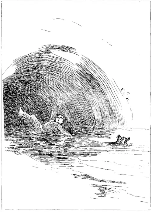 How long it lasted — this fearful ride in the arms of these mad waters, rushing as if for life or death through this narrow bore — I know not; I only know that my ears were suddenly assailed with a mighty whizz and rush of water as through the nozzle of some gigantic hose, and that I was shot out into the glorious sunshine, out into the grand, free, open air of the upper world, and sent flying up toward the dear, blue sky with its flecks of fleecy cloudlets, and Bulger some twenty feet ahead of me, and that then, with a gracefully curved flight through the soft and balmy air of harvest time, we both were gently dropped into a quiet little lake nestled at the foot of a hillside yellow with ripened corn. In a moment or so we had swum ashore. Bulger wanted to halt and shake the water from his thick coat, but I couldn’t wait for that. Wet as he was, I clasped my heart while he showered caresses on me. But not a word was said, not a sound was uttered. We were both of us too happy to speak, and if you have ever been in that state, dear friends, you know how it feels.