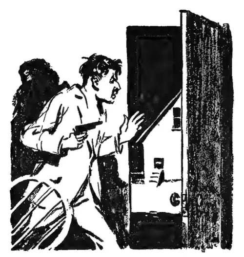 His brakes shrilled; his car slewed perilously, slid, came to rest. Out of his pocket, with a trembling hand, he snatched the pistol.