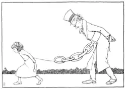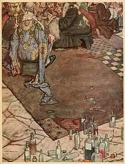 'At last, after two months of sickness, and despite every attention and kindness on the part of the doctor, the patients began to weary of being ill and kept to their beds for so long. The Lord Mayor was the first to arise and, although very weak in the legs, he managed to crawl to the top of the stairs, and looking down, beheld, to his dismay, the dreadful state of ruin in which everything was involved. He called for his servants as loudly as his weakness would allow him, and, obtaining no reply, he scrambled down the stairs on his hands and knees, and clamoured shrilly for a cut from the joint. As, of course, there was no one