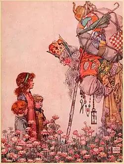 NOW it happened one morning as Bill was shepherding his little flock across the downs, whither they loved to ramble on a fine summer's day, that Hannibal, Quentin, and Boadicea came running up to him with the wonderful tidings that they had discovered a real golden crown lying on the top of a hayrick. Bill hastened to the spot, and there, sure enough, was a most beautiful crown, ornamented with what he took to be priceless gems. Looking all round and seeing no one to whom it might belong, he climbed the rick and attempted to remove the treasure. But, try as he would, it still resisted his efforts, until at last, with one mighty wrench, he seemed to elicit a groan from the depths of the rick, and presently the crown arose apparently of its own accord and disclosed the head of an aged man firmly fixed therein. Soon his neck, then his shoulders appeared, as gradually the old fellow lifted himself from his place of hiding and climbed down the sides of the rick and stood trembling in the midst of the children, who now wonderingly gathered round him.