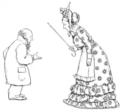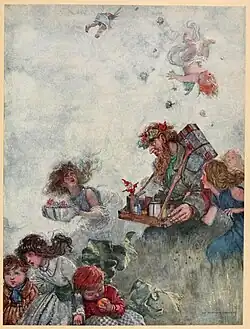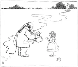 At tea-time they all came skipping back, bringing with them a little old man they had found, apparently lost, and moping about the common. He carried in front of him a pedlar's tray, on which were exposed for sale many little oddments, such as reels of cotton, needles, pins, ribbons, and even little toys, which he now hawked round amongst the assembled company. As many as were able bought some small thing or other out of kindness to the little merchant, and the good-natured old monarch invited him to tea.
