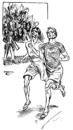 As they swung into the straight and ended the first lap, a roaring filled his ears, and he knew dully that the crowd was cheering. They rounded the turn again and kept on up the back stretch. Bill was running like a machine. His mind was concerned with nothing but following those two blue jerseys. For some time he had faintly heard a low "pad, pad" behind him. All at once it grew louder and resolved itself into the thud of a runner's feet. A hand, then an arm, then a head and shoulders came into his range of vision. They were passing the stands for the second time, and the roar of the crowd was in his ears again. The other runner had drawn slowly past him and shut off his view of Dean. He recognized the red jersey of Halloran. Bill drew himself together to spurt hotly and pass this hateful red jersey, but a still voice within him kept calling, "Keep cool, keep cool! Remember, this mile will be won in the last hundred yards," and he stuck doggedly to his stride. A blue jersey fell back to the red one. Dimly Bill saw a figure with wobbly knees and pumping arms. Then he ranged alongside and the figure dropped back out of sight.