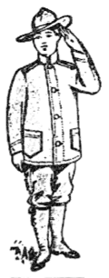 Handsome, durable Scout Suits, just like picture, firm, strong khaki, Scout Suit color. Suit consists of Coat, Trousers, Leggings and Hat. Coat has brass buttons, trousers are full length, leggings lace up, hat has wide stitched brim. We give Boys' Scout Suit complete for selling 24 pieces of our goods at 10¢ each. Write for goods. We send them prepaid. When sold return $2.40 and we send this full Scout Suit.