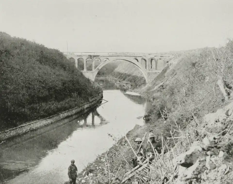 The two weak points about the Canal which were destined to have a decisive effect on the outcome of the battle were: (1) the bridges which were necessary for the supply of the enemy troops on the western bank, and so could not be destroyed in good time; and (2) the existence of certain concrete dams which had presumably been built by the enemy to serve as locks to retain the water. Where the Canal crosses the valley of the Omignon, south of Bellenglise, it is banked up above the level of the surrounding country; and without these concrete dams, there was risk of our guns breaching the banks, allowing the water to drain away, and so diminishing the value of the Canal as an obstacle.