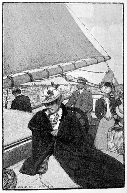How different it was with Amy! With her veil tied tightly over her hair, with a cape that the boys brought up from the cabin thrown over her shoulders, sitting on the floor of the deck with her back braced against the cabin, she enjoyed every minute. This was something that she had never hoped to enjoy, to have a sail in a real yacht—and she might have added “with real people,” so seldom had it been her good fortune to have the society of young persons of her own age.