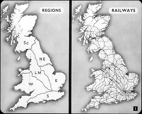 It’s always a good thing, when you’re talking about railways, to start off with maps, and that’s why I’m asking you first of all to have a look at these two railway maps of Britain. The one on the right shows the important railway lines, and the one on the left shows the six regions into which British Railways have been divided – the Eastern, London Midland, North Eastern, Scottish, Southern and Western Regions. The right-hand map shows how densely covered with railways this island is, particularly England. Just look at the railways round London, and round Birmingham, Manchester and Glasgow. See how thick they are in the industrial areas of South Wales and Lancashire; and see, too, how many lines connect London with the North of England.