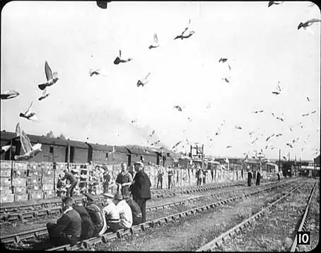 It’s the start of a pigeon race! You might not think that there was much connection between homing pigeons and the railways, yet here you can see British Railways releasing about fifteen thousand pigeons from Newcastle at Welwyn Garden City Station.