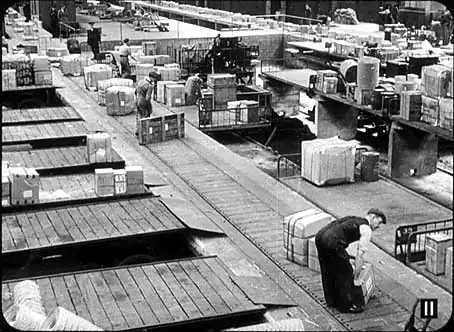 In this depot, the rail-head at Lawley Street, Birmingham, the mechanical handling of small consignments is the most up to date in the world. On the left, a row of drays is backed up to the moving belt on which the man is standing. On the right are one. or two loaded trolleys, and in the background are the railway wagons. This shed deals with two kinds of traffic – what’s called town traffic, which is loaded on to drays for delivery in Birmingham and district, and transship traffic, which is loaded in rail wagons for further destinations.