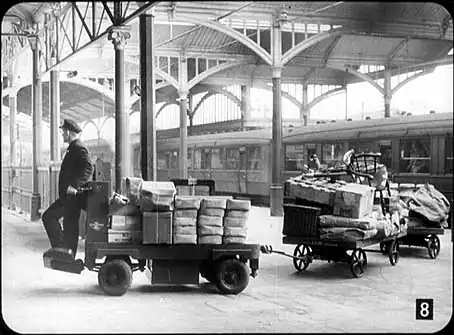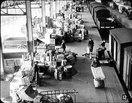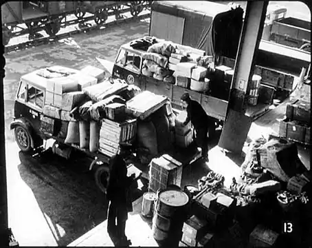 In this next picture we can see the process taken a stage further. The road van, which is owned and operated by the railways, has now got its load almost complete. On the left you can see the checker with the list of goods, which will later be handed over to the driver when he takes the lorry away. |