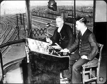 Now here are the men in the control tower. This, by the way, is at Toton, near Nottingham, but the principle is exactly the same. On the desk are lines which correspond to the tracks; and the buttons, which have a sort of miniature signpost on them, are turned round to move the points at the entrance to the yard. The older man is holding a microphone in his hand by which he can speak through loud speakers to the men on duty outside in the marshalling yard.