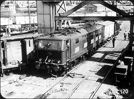 Here is one of them being pushed on to the train ferry at Harwich on its way to Holland for trials on the Dutch electrified railway system. On the top of the locomotive, folded fiat, you can see the pantograph.