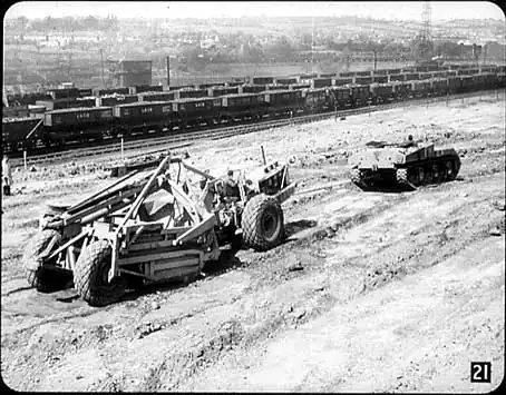 Here is a picture of such an engineering job actually in progress – at Toton marshalling yards. It was necessary, in order to moderise the yard, to remove a hill fifty feet high, and to do this job the railway engineers used twelve mechanical excavators hauled by army tanks. You see one of them getting ready to go into action here. This excavator slices earth off the surface of the ground and dumps it in a box behind for clearing.