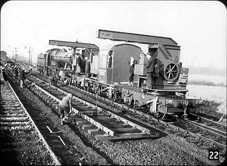 The special crane you see travels up and down the neighbouring track lifting up the old track bodily in rail lengths, and putting new, pre-assembled lengths of track in place. The fiat wagons which brought the new track are used to take away the old. The track shown here is the well-known bull-head type of track that has been used so long by British Railways. |