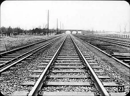 Recently, however, a new type of track using flat-bottomed rail has become the standard, and this is a stretch of main line near Langley (Bucks) laid with this new type of track. The rails here are laid directly on cast-iron plates and are held in place by resilient steel spikes. This type of track is, of course, also laid in pre-assembled lengths by cranes like the one you have just seen. |