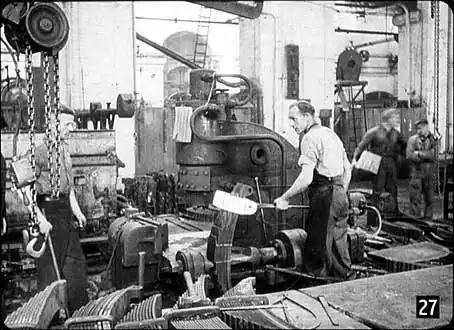 Here’s a picture taken inside the railway locomotive works at Darlington, showing one little aspect of the work there – an operator holding a white-hot steel buckle which he will drop over the locomotive spring you can see below it. The chalk marks show where the buckle will be fixed. Then, when it cools, the metal will contract and bind those pieces of steel together in a grip which nothing will break. |