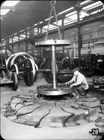 Now here you can see that locomotive wheel, or one like it, with its tyre in place, waiting for the time when it can be fitted in place in the locomotive being built on the right. When the time comes for this loco to have its wheels put on, it will be swung in the air, the wheels will be arranged in place underneath it, and it will slowly be lowered on to them.