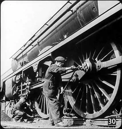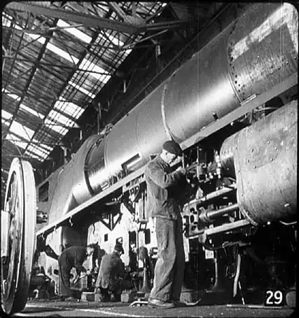 Waterloo Station, London. This is what is called the concourse. To the left are the platforms, and to the right, the booking offices, refreshment rooms and general offices. Behind these is the approach road. The passenger comes first to the booking offices, then goes out on to the concourse and passes the timetables in the middle of the open space: he then comes to the train indicator, and finally arrives at the platforms themselves. The station is arranged so that the passenger comes across everything in the right order. Now so far you’ve heard what might be called the outside story of the railways. But there’s an inside story, too – the story of a whole organisation of which the ordinary man or woman knows little. British Railways, for instance, build almost all the steam locomotives they use... |
